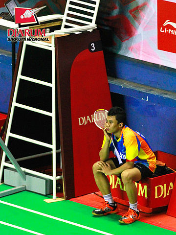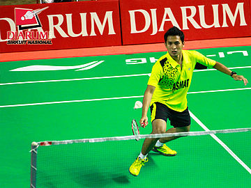 Bandar Sigit (Sarwendah) bersiap mengembalikan shuttlecock ke arah Garry Lam (Exist).
