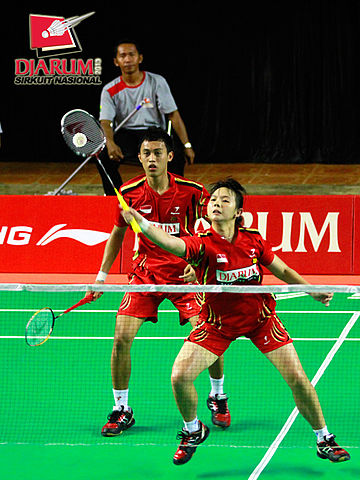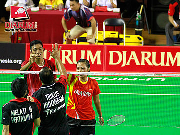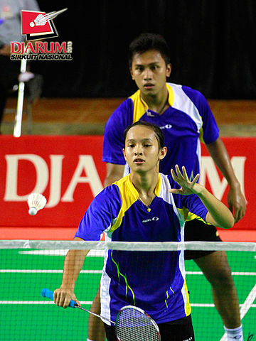 Tedi Supriadi/Della Agustia (PB Djarum) menyambar pengembalian tanggung dari pasangan Rian Swastedian/Masita Mahmudin (Pusdiklat Jaya Raya).
