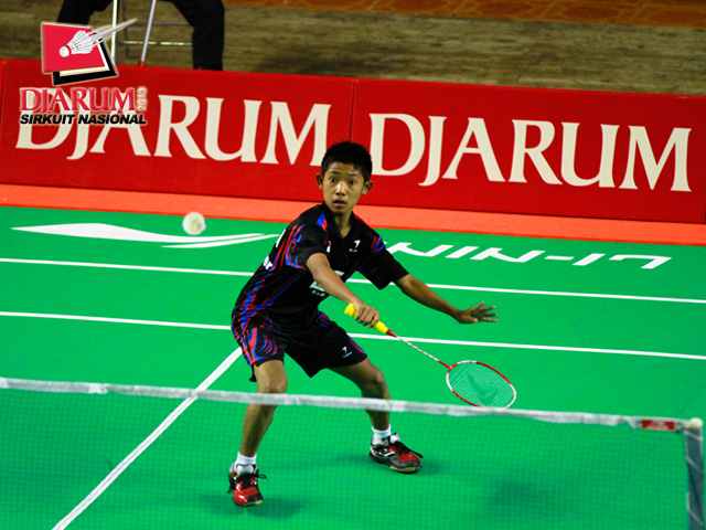 Pebulutangkis tungga pemula putra asal PB Djarum, Bagas Kristianto bersiap mengembalikan shuttlecock ke arah M. Rehan Diaz (Mutiara Bandung).