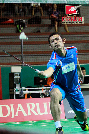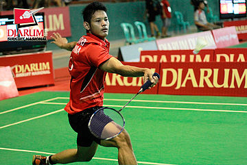 Andreas Adityawarman (Musica Champion) mengembalikan shuttlecock ke arah Raypaksi Labudo (PBSI Kab. Sangihe).