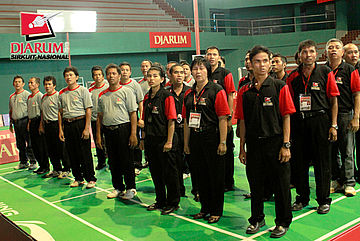Para wasit dan hakim garis saat menyanyikan lagu Indonesia Raya.