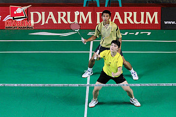 M. Maftuki/Elizabeth Matindas (Pelatprov DKI Jakarta/SGS PLN) bersiap mengembalikan shuttlecock ke arah Angger Sudrajad/Revenska Cintya (PB Djarum).
