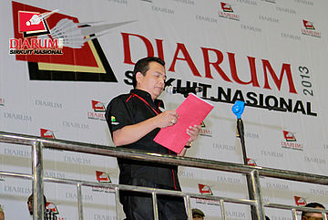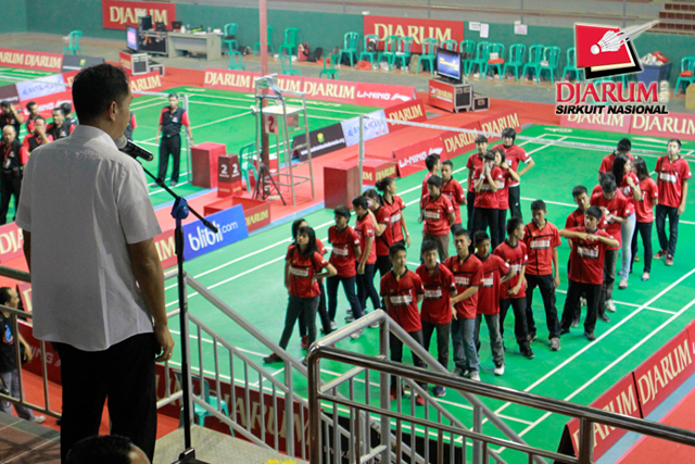 Ketua Panitia Djarum Sirkuit Nasional (Sirnas) Sulut Open 2013 saat menbacakan laporan kepada Ketua Umum PB PBSI, Gita Wirjawan di GOR Ari Lasut, Manado.