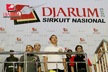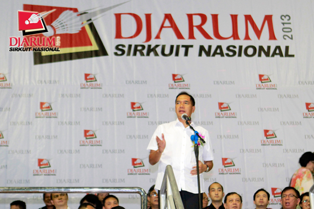 Ketua Umum PB PBSI, Gita Wirjawan (kiri) saat memberikan sambutan sekaligus membuka Djarum Sirkuit Nasional (Sirnas) Sulut Open 2013, di GOR Ari Lasut, Manado.