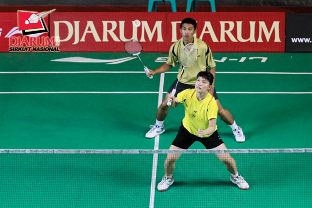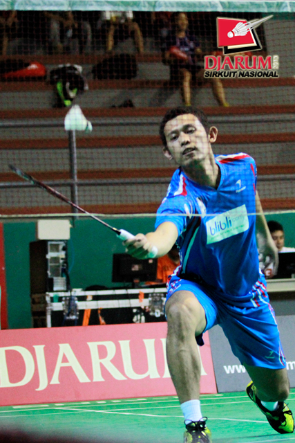 Rizky Antasari (Hi Qua Wima) mengembalikan shuttlecock ke arah Febry Hendrawan (PBSI Baggai).