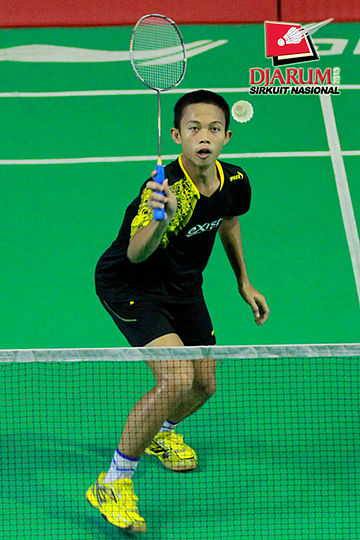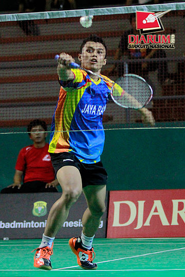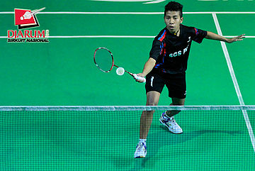 Eka Fajar (Jaya Raya) mengembalikan shuttlecock ke arah Elham Saptono (Candrra Wijaya).