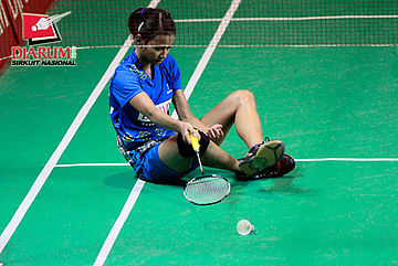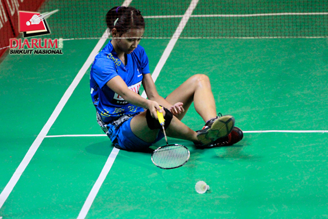 Dinar Dyah (PB Djarum) terjatuh saat berusaha mengembalikan shuttlecock ke arah Tike Arieda (Jaya Raya Suryanaga).