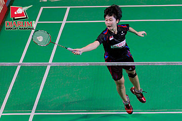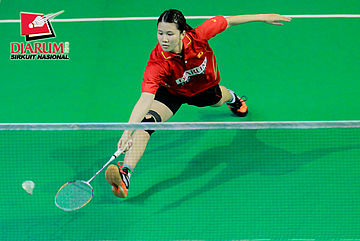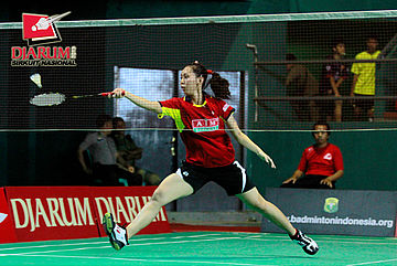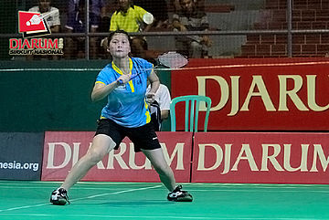 Tike Arieda (Jaya Raya Suryanaga) mengembalikan shuttlecock ke arah Dinar Dyah (PB Djarum).