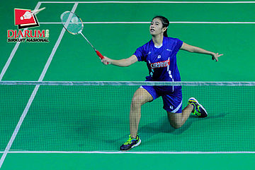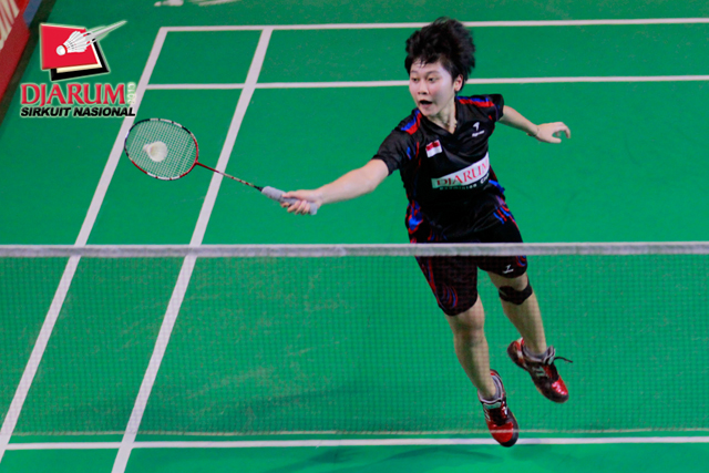 Marsa Indah (PB Djarum) menyambar pengembalian tanggung dari Rafika Mutiara Guniarti (Candra Wijaya).