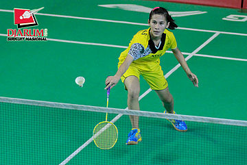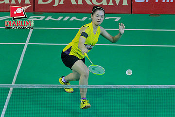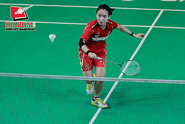 Priskila Siahaya (Exist) berusaha mengembalikan shuttlecock ke arah Intan Dwi Jayanti (PB Djarum).