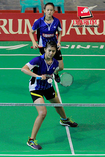 Bunga Fitriani/Mayrina Lukmanda (Mutiara Bandung) mengembalikan shuttlecock ke arah Nisak Puji Lestari/Rika Rositawati (Mutiara Bandung).