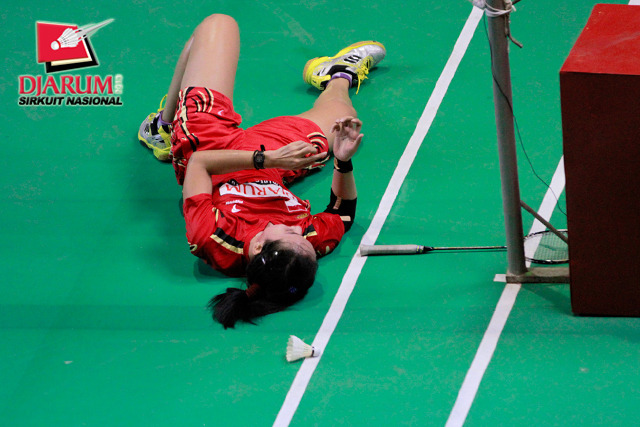 Ana Rovita (PB Djarum) harus terjatuh saat berusaha mengembalikan shuttlecock ke arah Febby Angguni (PB Djarum).