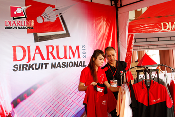 Salah satu user Djarum saat menjamu pengunjung yang ingin membeli merchandise di Booth Djarum Sirkuit Nasional Sumatera Open 2013, Medan