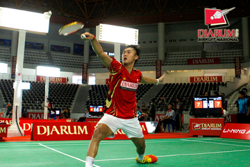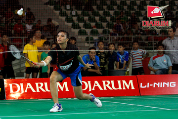 . Rudi Cahyadi (PB Djarum) mengembalikan shuttlecock ke arah Qin Zheng (China).