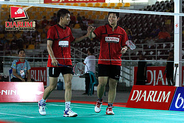 ganda taruna putra PB Djarum, Hantoro (kanan) dan Ricky Alverino (kiri) saling bersalaman usai memenangkan pertandingan atas Leonardi/Marco (Shamrock).