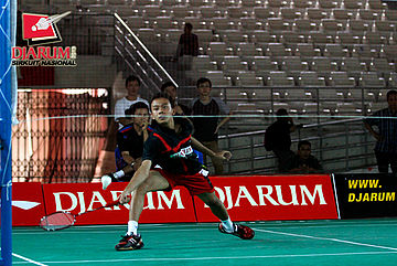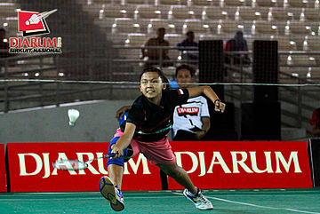 Ramadhani M. Zulkifli (PB Djarum) bersiap menggapai pengembalian dari Vega Vio (Mutiara Bandung).