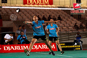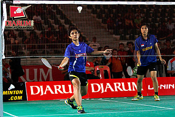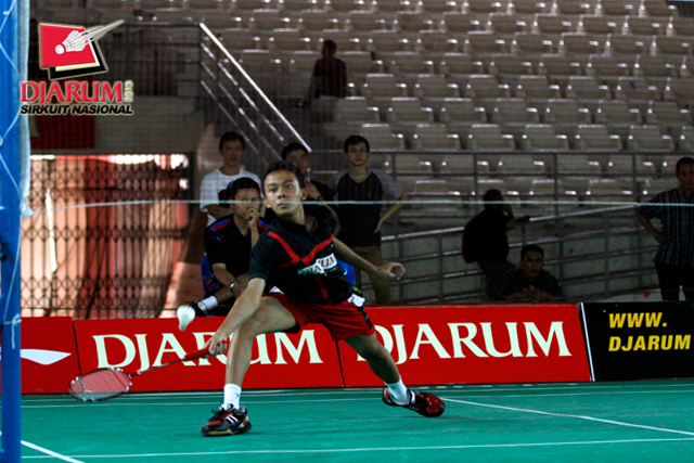 Bagas Kristianto (PB Djarum) mengembalikan shuttlecock ke arah Langgeng Prakoso (PB Djarum).