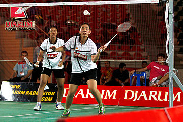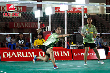 Dini Fitri/Inten Ratnasari (SGS PLN) mengembalikan shuttlecock ke arah Linda Mutiara/Sinta Arum (Mutiara Bandung).