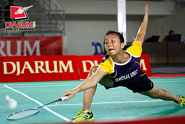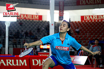 Rusydina Antar Dayu (Tangkas Specs) berhasil menggapai dan mengembalikan shuttlecock ke arah Tieke Arieda (Jaya Raya Suryanaga).