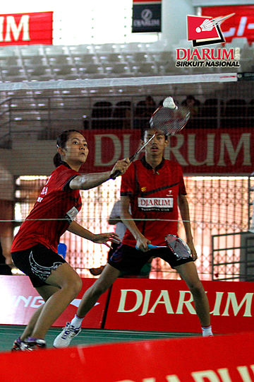 Ardiansyah Putra/Devi Tika Permatasari (Pertamina Indonesia/SGS PLN) menyambar pengembalian tanggung dari pasangan Riyo Arief/Nadya Melati (Hi Qua Wima/Pertamina Indonesia).