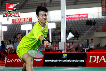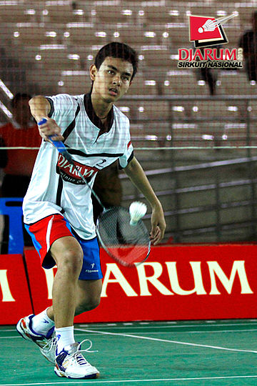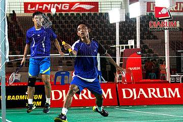 Langgeng Prakoso (PB Djarum) mengembalikan shuttlecock ke arah Bagas Kristianto (PB Djarum).