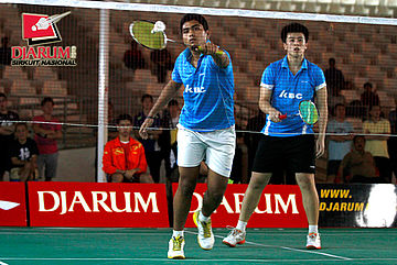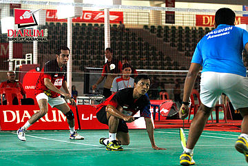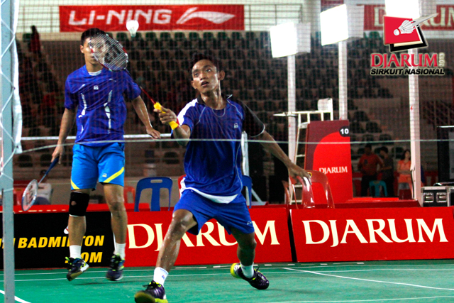 Chrisna Adi/Ridho Akbar (Halim) mengembalikan shuttlecock ke arah Hermansyah/Senatria Agus (Jaya Raya/SGS PLN).