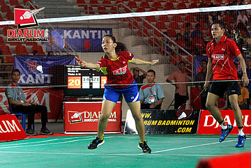 Linda Mutiara (Mutiara Bandung) bersiap mengembalikan shuttlecock ke arah Febtria Adisthya (Mutiara Bandung).