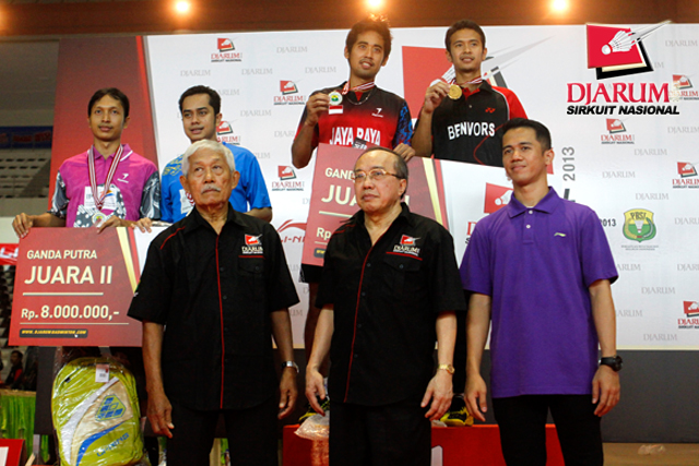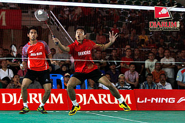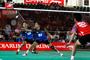 M. Asykuru/M. Shahibul (Indonesia Port Corporete) mengambalikan shuttlecock ke arah Hermansyah/Senatria Agus (Jaya Raya/SGS PLN).