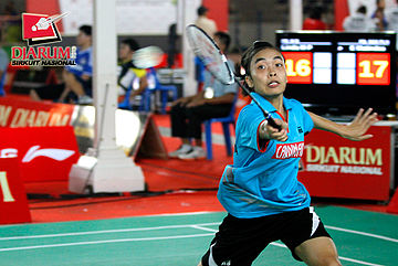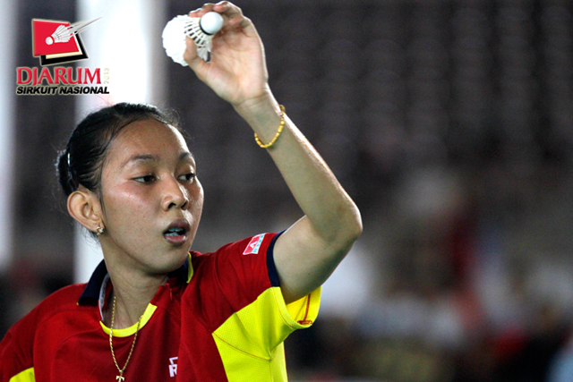 Ganis Nurrahmandani (Pertamina Indonesia) mengembalian shuttlecock ke arah Tieke Arieda (Jaya Raya Suryanaga).