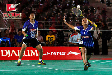 Cynthia Shara/Ramadhani Hastiyanti (PB Djarum) bersiap menghadang serangan yang dilepaskan Nisak Puji Lestari/Rika Rositawati (Mutiara Bandung).