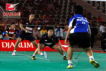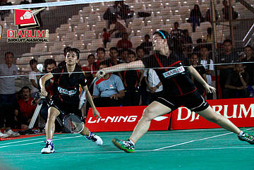 Chintia Rhizta/Ristya Ayu (PB Djarum) berhasil menghadang serangan yang dilepaskan Dini Fitri/Inten Ratnasari (SGS PLN).