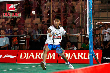 M. Rehan Diaz (Mutiara Bandung) berhasil membaca pengembalian dari Bagas Kristianto (PB Djarum).