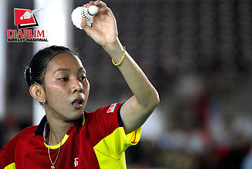 Linda Mutiara (Mutiara Bandung) mengembalikan shuttlecock ke arah Elizabeth Matindas (SGS PLN).