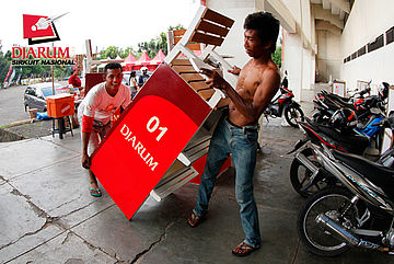 Dua orang pekerja terlihat sedang menggotong kursi wasit.