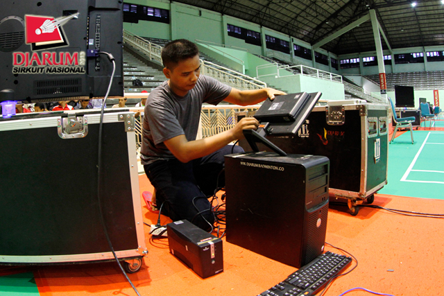 Salah satu anggota tim Live Score saat memasang perangkat kerjanya.