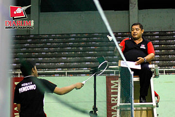 Wasit memberikan shuttlecock kepada Syaherdillah Wijianto (Pendowo).