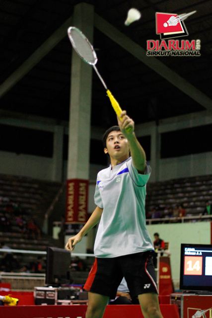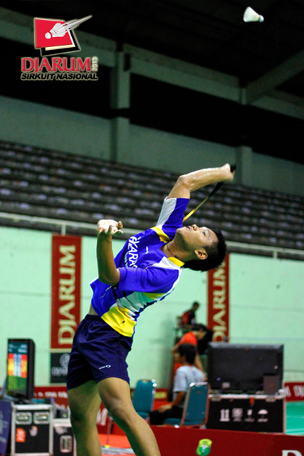Taufan Fadli (Candra Wijaya) mengembalikan shuttlecock ke arah Ridwan Arista (Pertamina Indonesia).