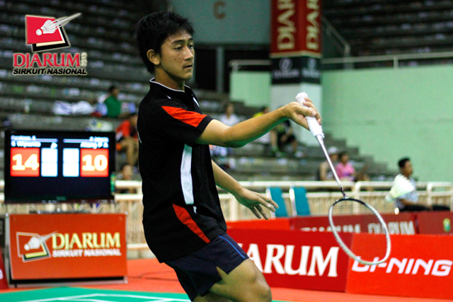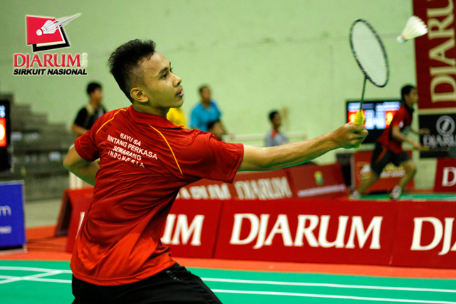 Akbar Bayu (Bintang Perkasa) mengembalikan shuttlecock ke arah Andry Ilmiawan (Jaya Raya Az Zikra).