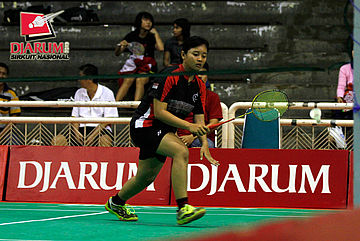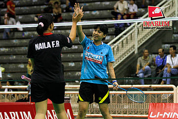 Naela (Champion Kudus) berusaha mengembalikan shuttlecock ke arah Deha Rizka (Barokah).