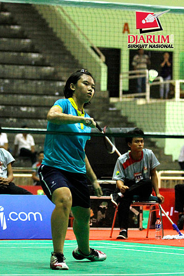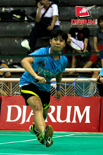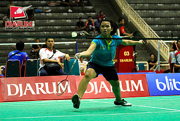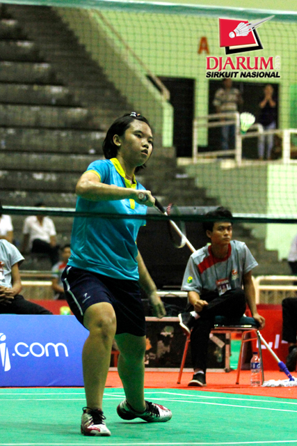 Sandra Rahayu (Sarwenda) mengembalikan shuttlecock ke arah Maharani Ayu (Hi Qua Wijaya).