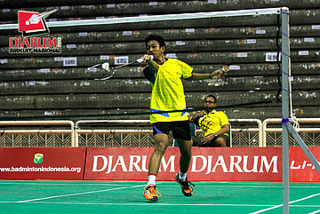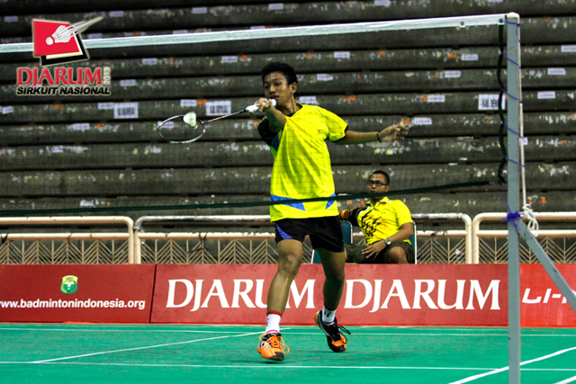 Akhmad Royyanda (Hi Qua Wijaya) mengembalikan shuttlecock ke arah Anugrah Nu (Tangkas Specs).