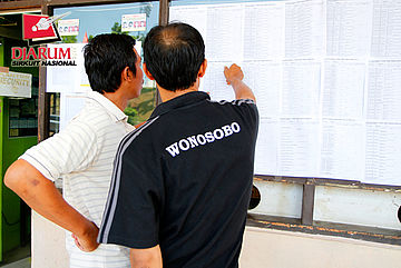 Dua orang ofisial tim saat melihat hasil pertandingan yang terpampang di depan Media Center.
