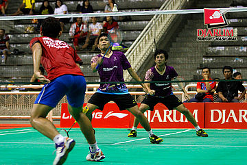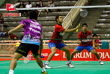 Abu Bakar/Tedi Supriadi (PB Djarum) bersiap menyambut pengembalian dari Achmad Fasich/Regawa Tamasuta (Citra Raya Unesa/Semen Gresik).