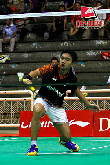 Alamsyah Yunus (Pertamina Indonesia) bersiap menyambar pengembalian dari Panji Akbar (Pelatnas).