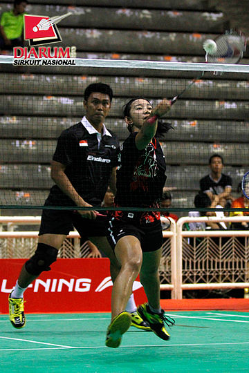 Ardiansyah Putra/Devi Tika Permatasari (Pertamina Indonesia/SGS PLN) menyambar pengembalian tanggung dari Didit Juang/Nurbeta Kwanrico (PB Djarum).