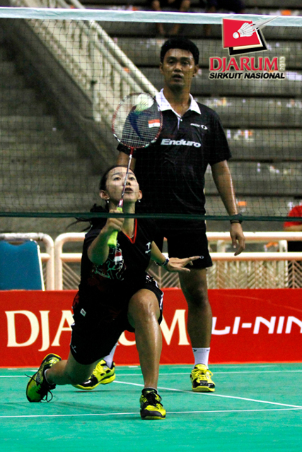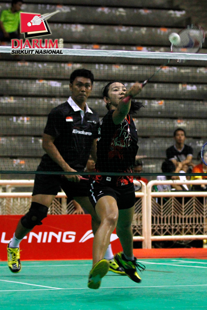 Ardiansyah Putra/Devi Tika Permatasari (Pertamina Indonesia/SGS PLN) mengembalikan shuttlecock ke arah Didit Juang/Nurbeta Kwanrico (PB Djarum).