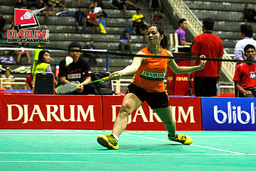 Rena Asela (PB Djarum) berhasil menghadang pengembalian dari Mia Mawarti (Guna Dharma).