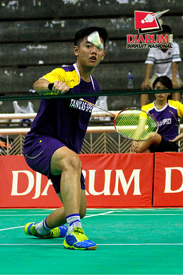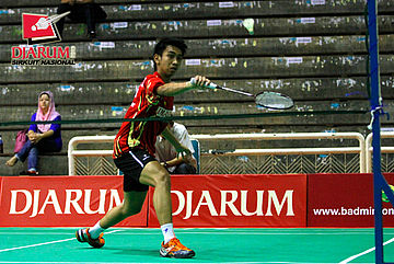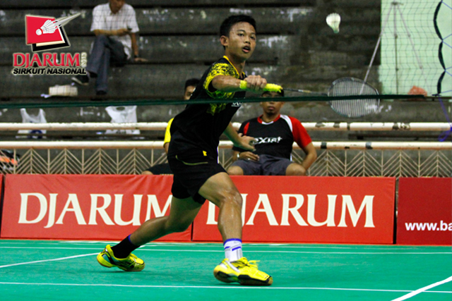 Moch. Revindra Reyhaldi (PB Djarum) mengembalikan shuttlecock ke arah M. Sulton Al Hakim (Mutiara Bandung).