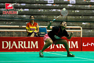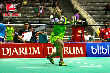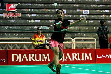 Febby Angguni (PB Djarum) berusaha mengembalikan shuttlecock ke arah Rusydina Antardayu (Tangkas Specs).
