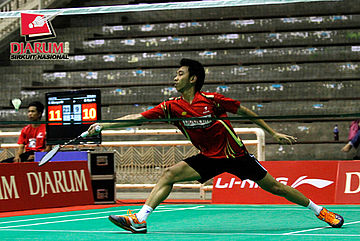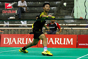 Moch. Revindra Reyhaldi (PB Djarum) berusaha menggapai penggembalian dari M. Sulton Al Hakim (Mutiara Bandung).